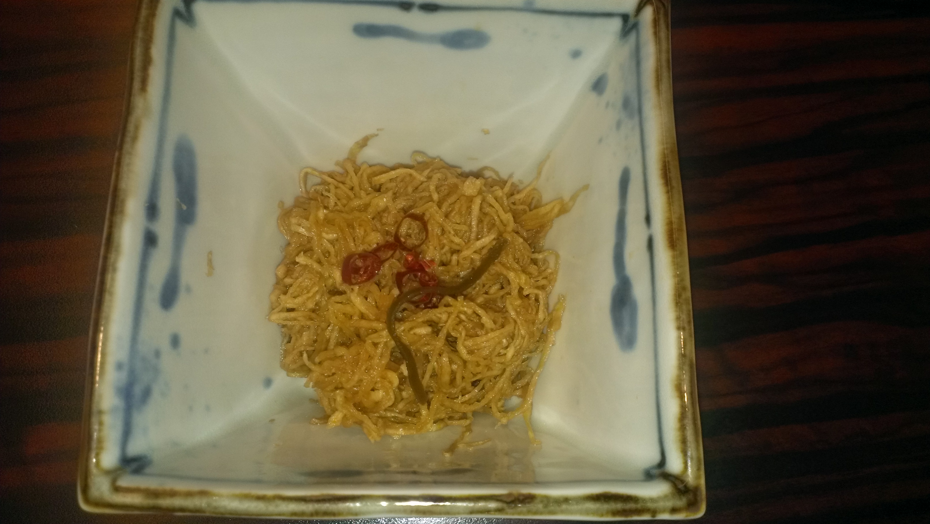 Tea to pour onto the purple rice, mixing in a sour plum and a small spoon full of wasabi into the saucy concoction.Tonkatsu is served on a hot plate of sizzling hot cabbage, garnished with shredded nori. Miso soup with kombu and picked 小黃瓜 on the side to complete the ensemble.