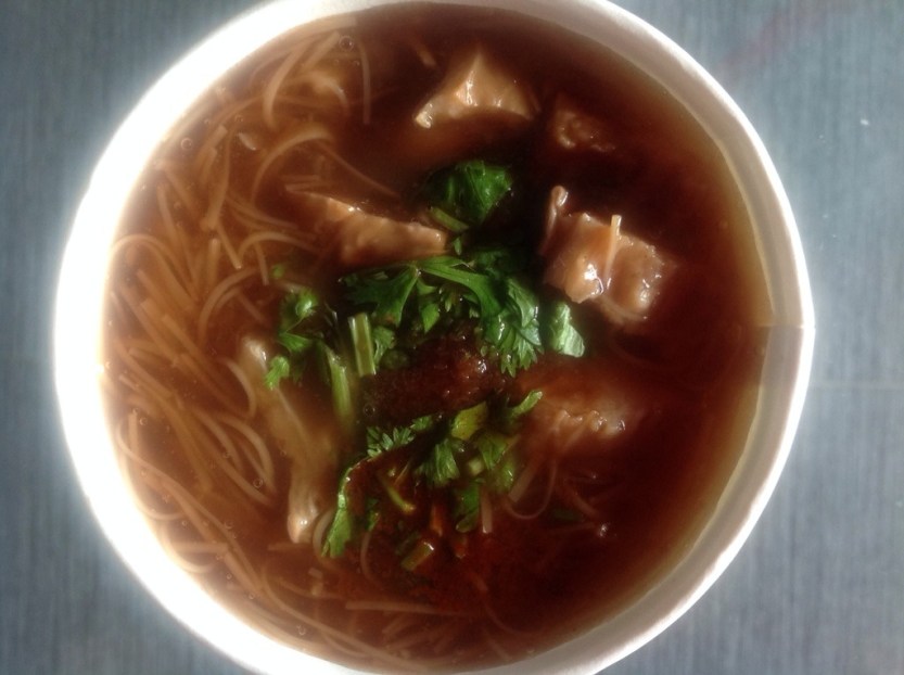 Ok, this is for the courageous ones. It’s yummy!! Thin noodles thickened with corn starch, mixed with various spices and sauces, topped with pieces of tripe, and cilantro. It may not look pretty but this is a small bowl of heaven. Come join me. I will be waiting.