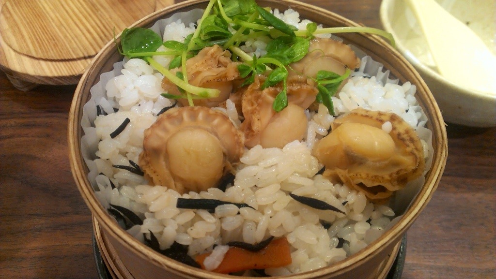 Steamed white rice with scallops, seaweed, carrots, and green sprouts
