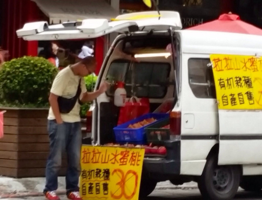 Food truck selling peaches in the east commercial area, touting that he planted these organic peaches himself.