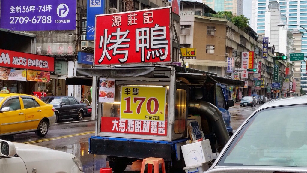 Food truck selling roasted duck at the corner of my building, half a duck for $170NT or approximately $5.7US. See that big metal tube? The interesting fact is that he roasts them right in the truck.