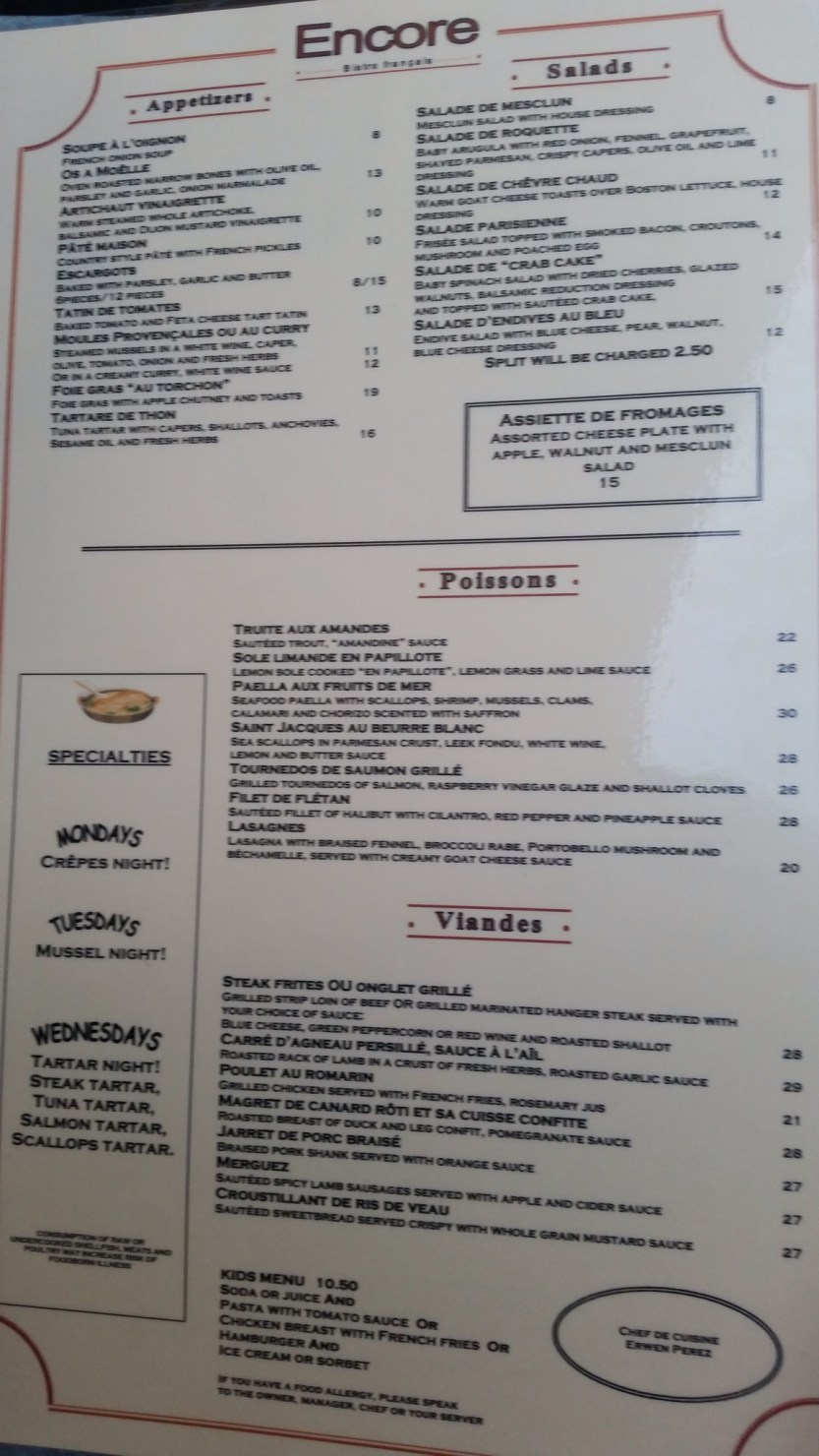 Last night’s experience at Encore, a French bistro in a highly French populated town, Larchmont N Y, was a bust. Mediocre at best. Dried grilled salmon, not true medium rare steak, and the waiter placed the check squarely in front of me vs. in front of my male companion. Where is the European chauvinism? Urgh!