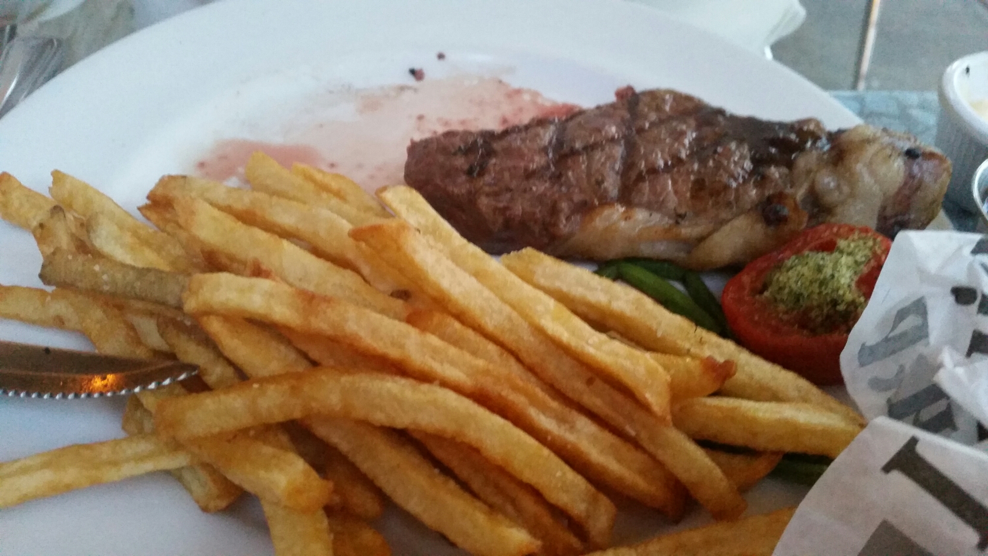 Second , the supposedly medium rare steak was medium with very sad and light char on the outside. The cut of meat was also a bit fatty.
