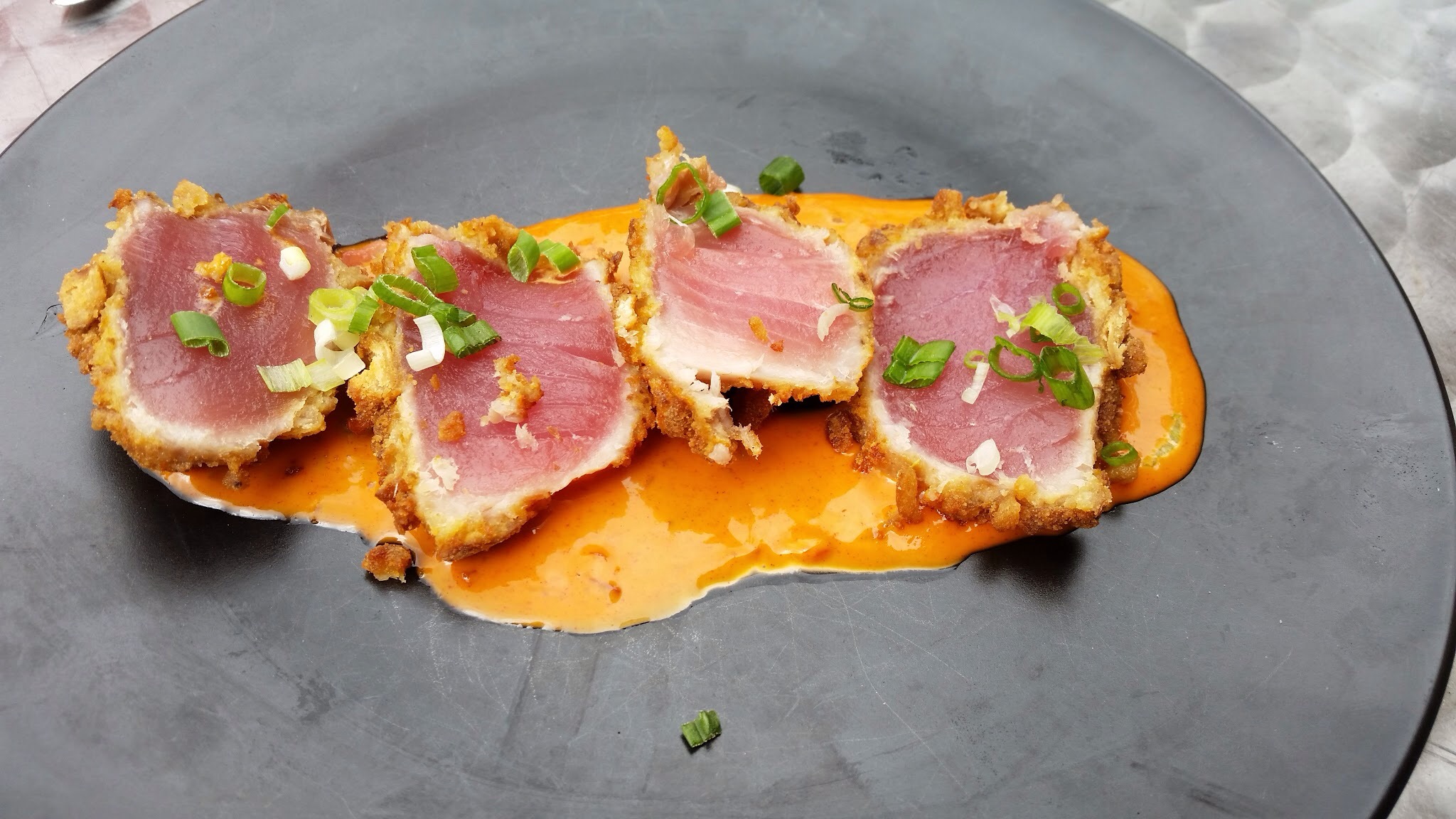 This is our appetizer, salty pretzel tuna with kimchi aioli and scallion. It is crunchy on the outside, soft on the inside with a kick of kimchi. Even the bees love it! We got many bee visitors throughout our lunch.