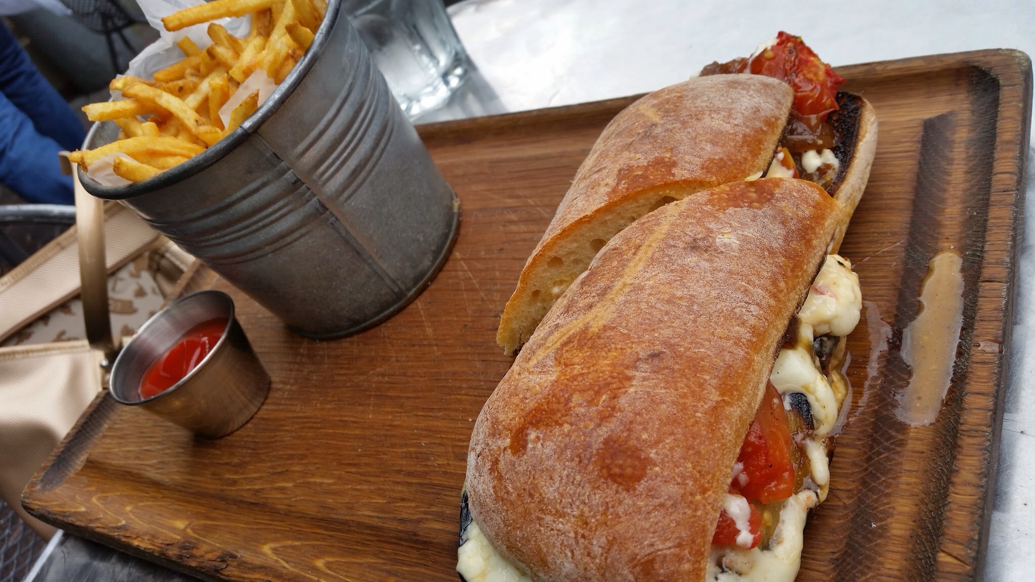 This is my friend’s Grilled Eggplant Sandwich, with chili aioli, caramelized onions, mozzarella, and fried. Look at those French fries!