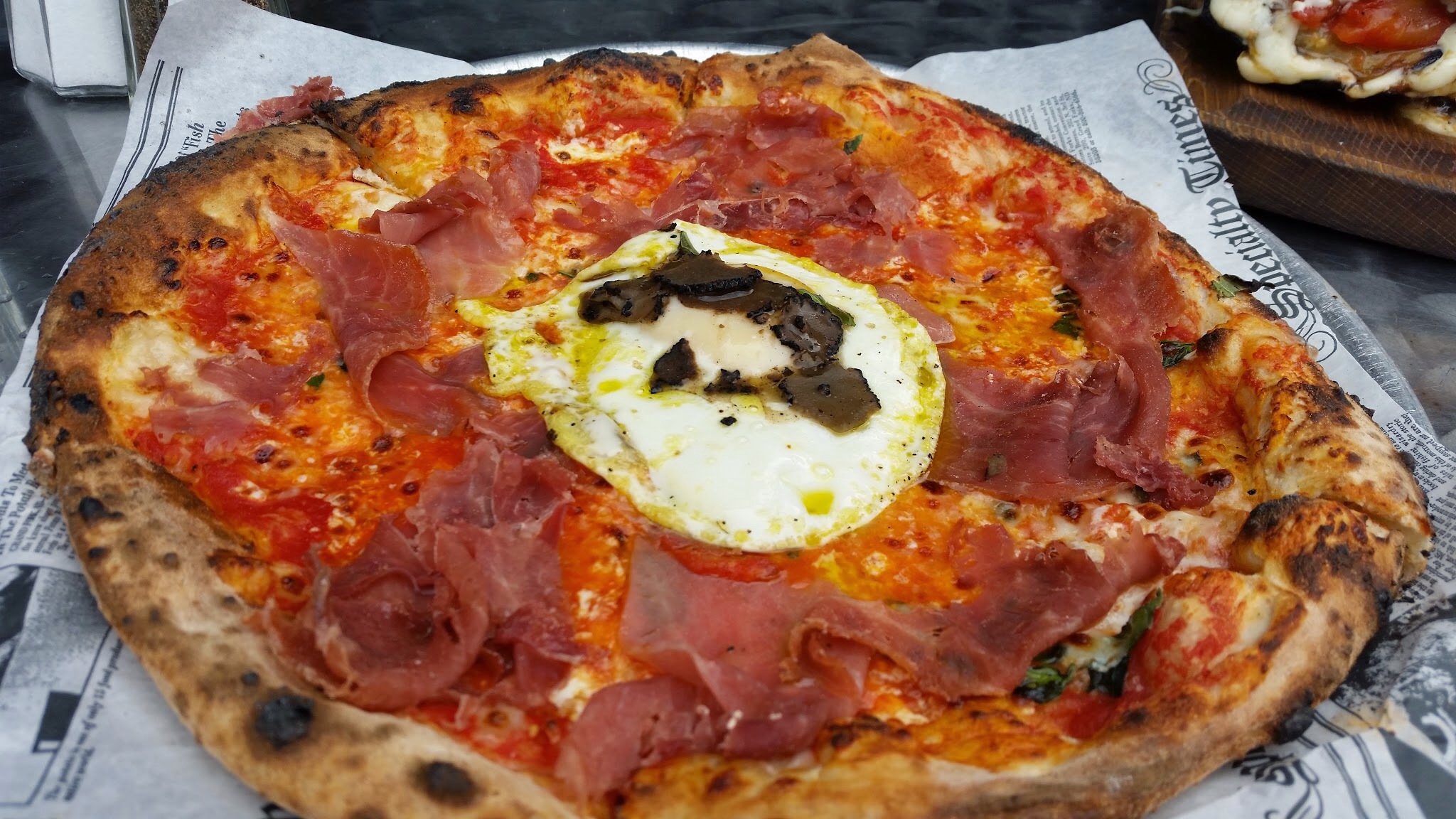 This is the Sunny Side Egg Pizza with prosciutto, tomatoes and truffles