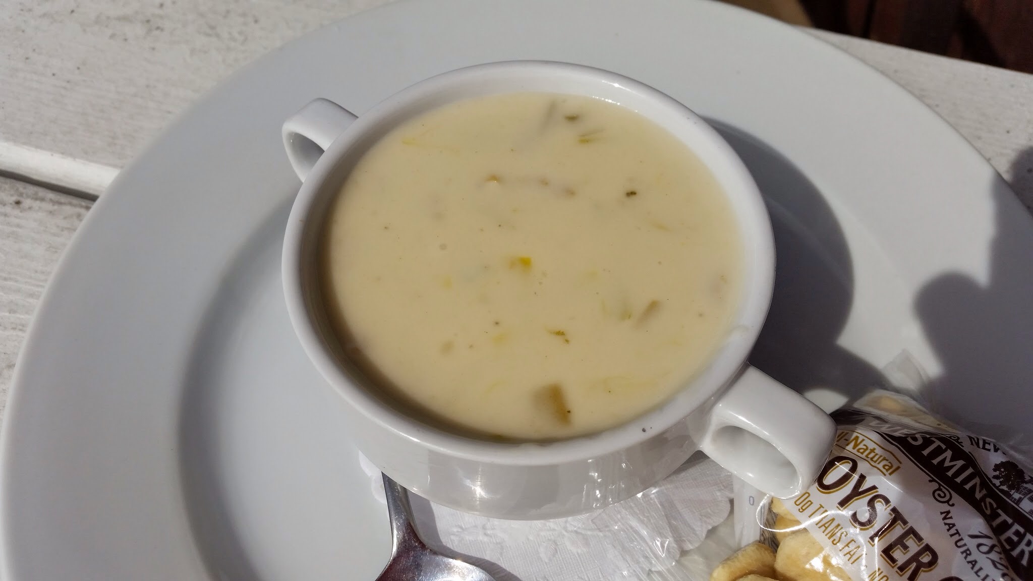 We both ordered the New England Clam Chowder. You know – ordering clam chowder from a harbor restaurant seems like an okay thing to do. No no. It was weird. The taste was funky. The thought of whether it had gone bad went through my head. It had not.