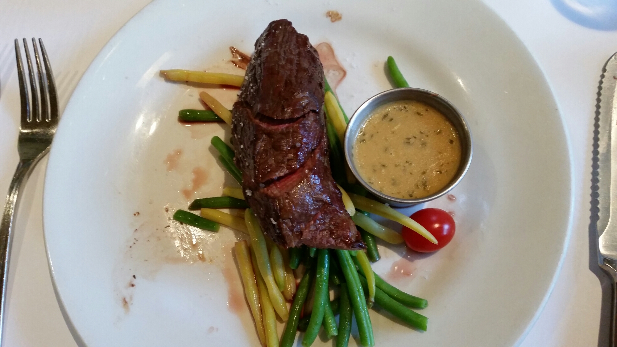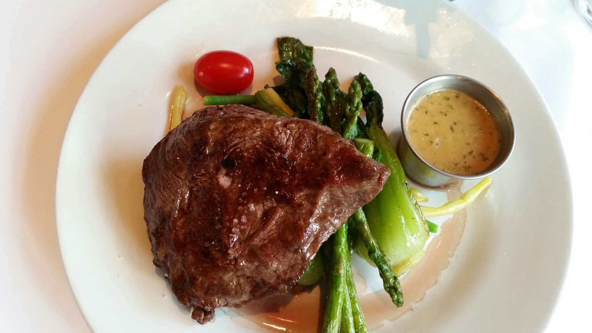 Here is my steak, supposedly medium, with green beans, grilled asparagus and bok choy. The sauce is a mushroom sauce. The steak was over done – it was well done. The steak was not salted and the mushroom sauce was bland. I was so looking forward to this steak!