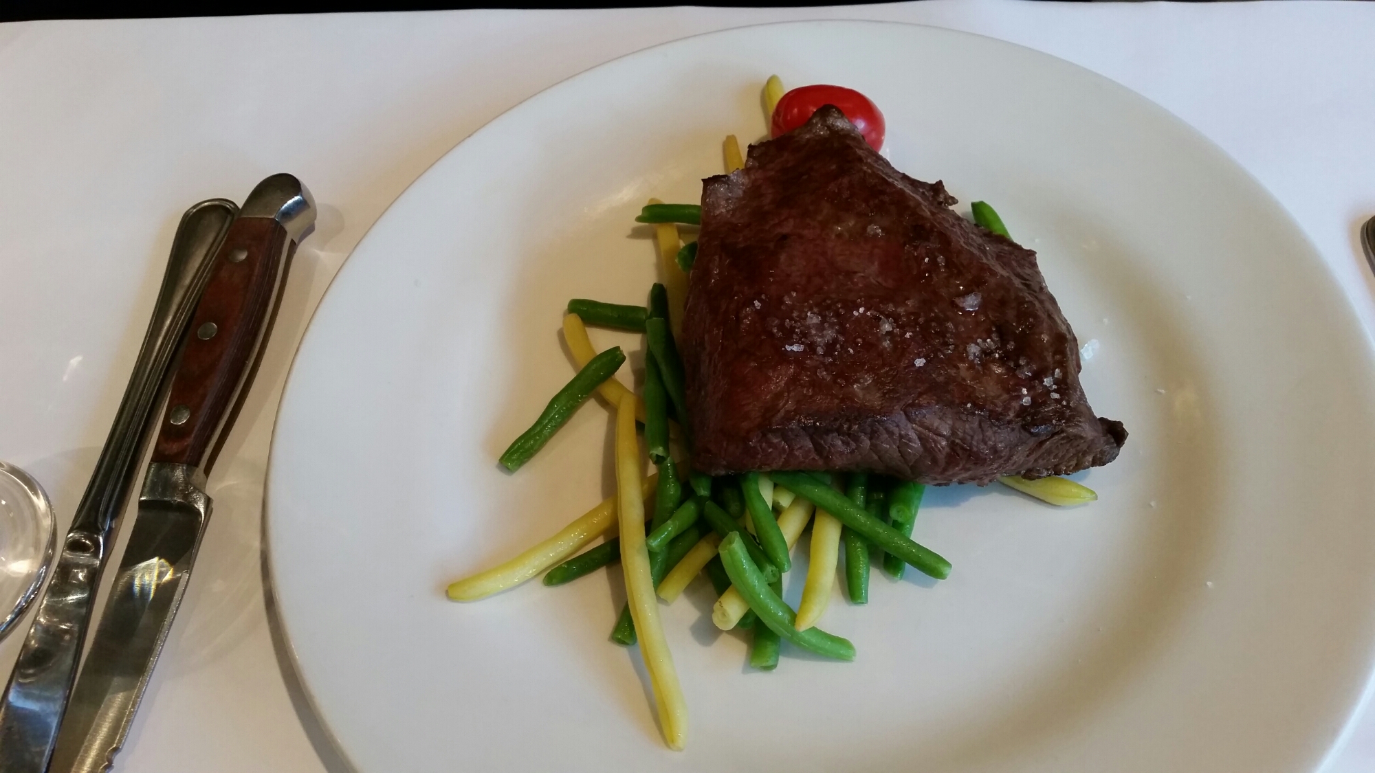 Voici mon steak, apparemment medium, avec des haricots, des asperges grillées et du bok choy. La sauce est faite de champignons. Le steak était pas medium: il était très bien cuit. Le steak n’avait pas de sel et la sauce n’était pas bonne. Je voulais vraiment avoir un bon steak!