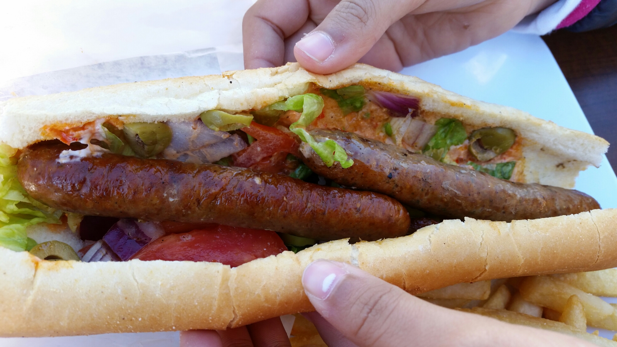 A good look at the sandwich: two links of merguez, tomatoes, lettuce, olives, onions and some of their special sauce in a baguette, panini style. The whole ensemble sings!