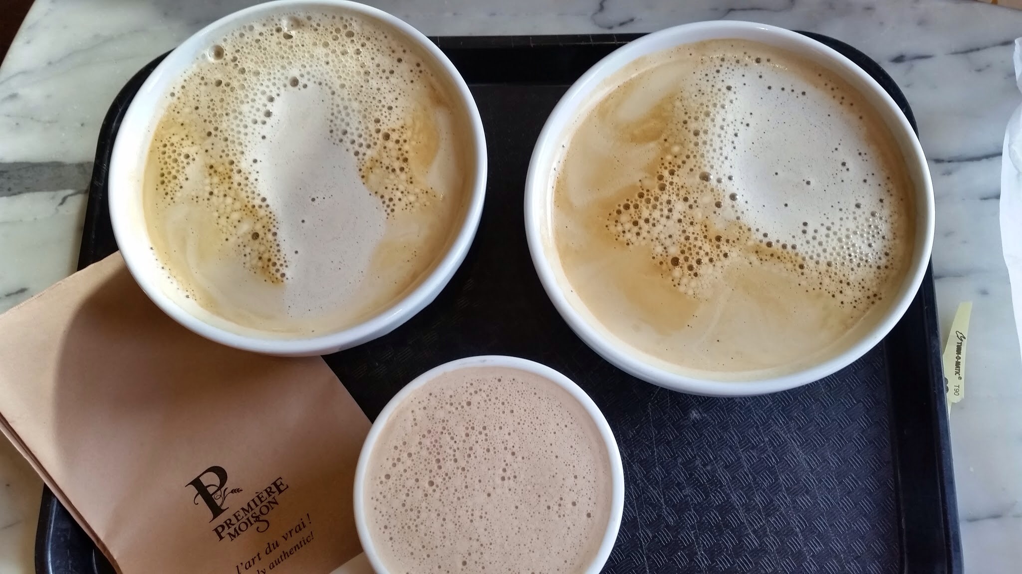 These are two large bowls of cafe latte and a small cup of hot chocolate from Boulangerie Première Moisson in Montreal
