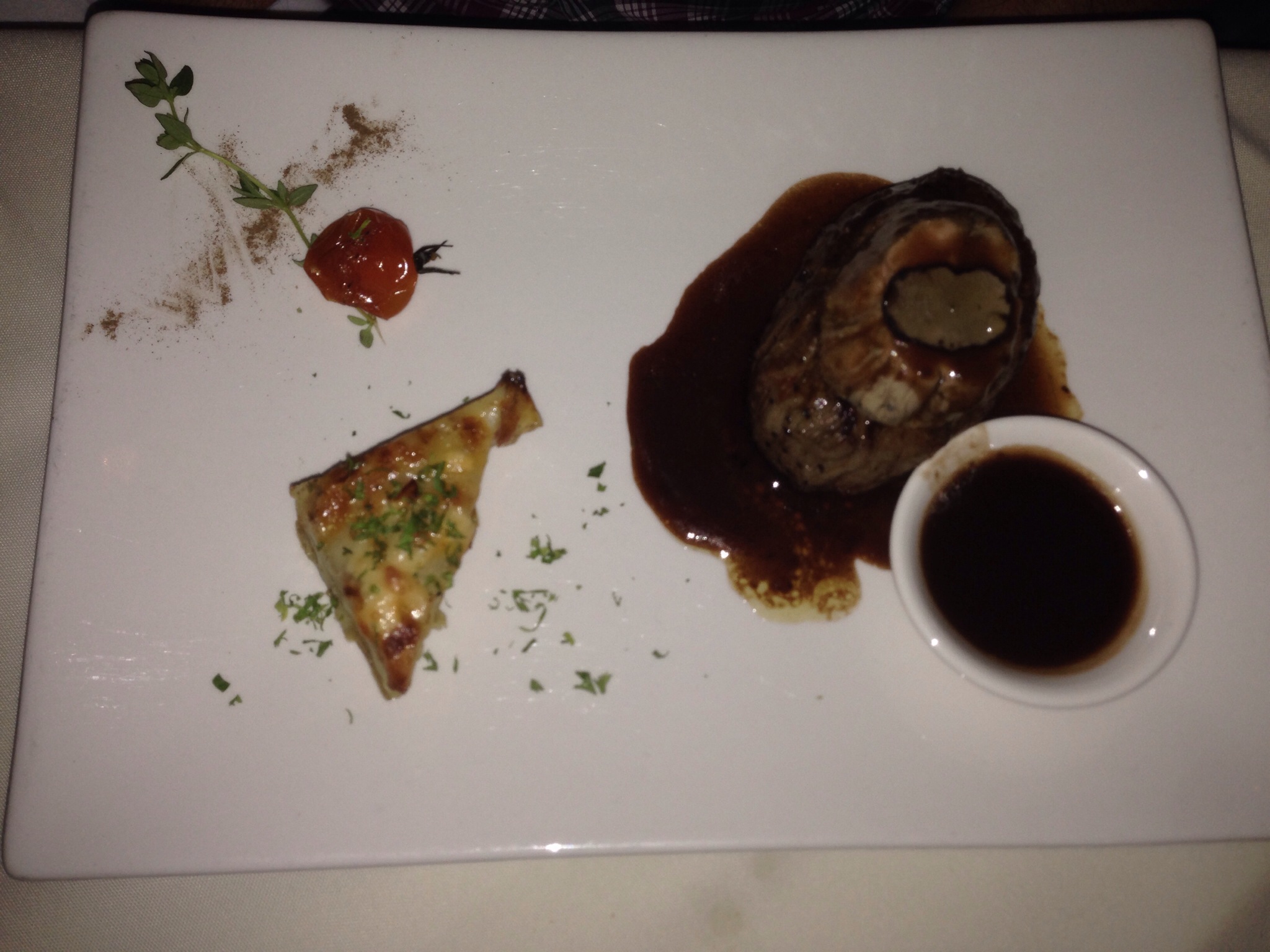 Tournedos Rossini: Seared filet mignon topped with foie gras (pate style), shallots, port and red wine truffles sauce. The sauce was strong and oozing with umami. I kept on stealing the sauce for my hanger steak.