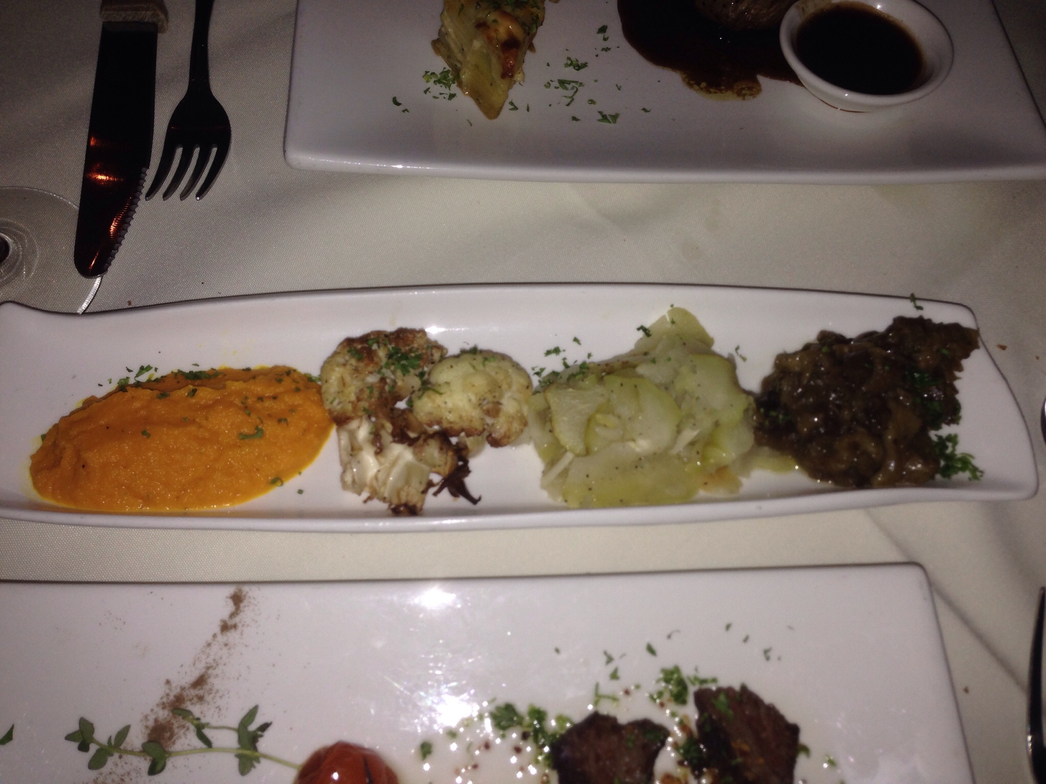 The side dish that came with our entrée to be shared, from left to right: pureed carrot, cauliflower, Mexican chayote, and caramalized eggplants. These are the best veggies I have ever tasted. I kept on wondering how much sugar and butter were put in.