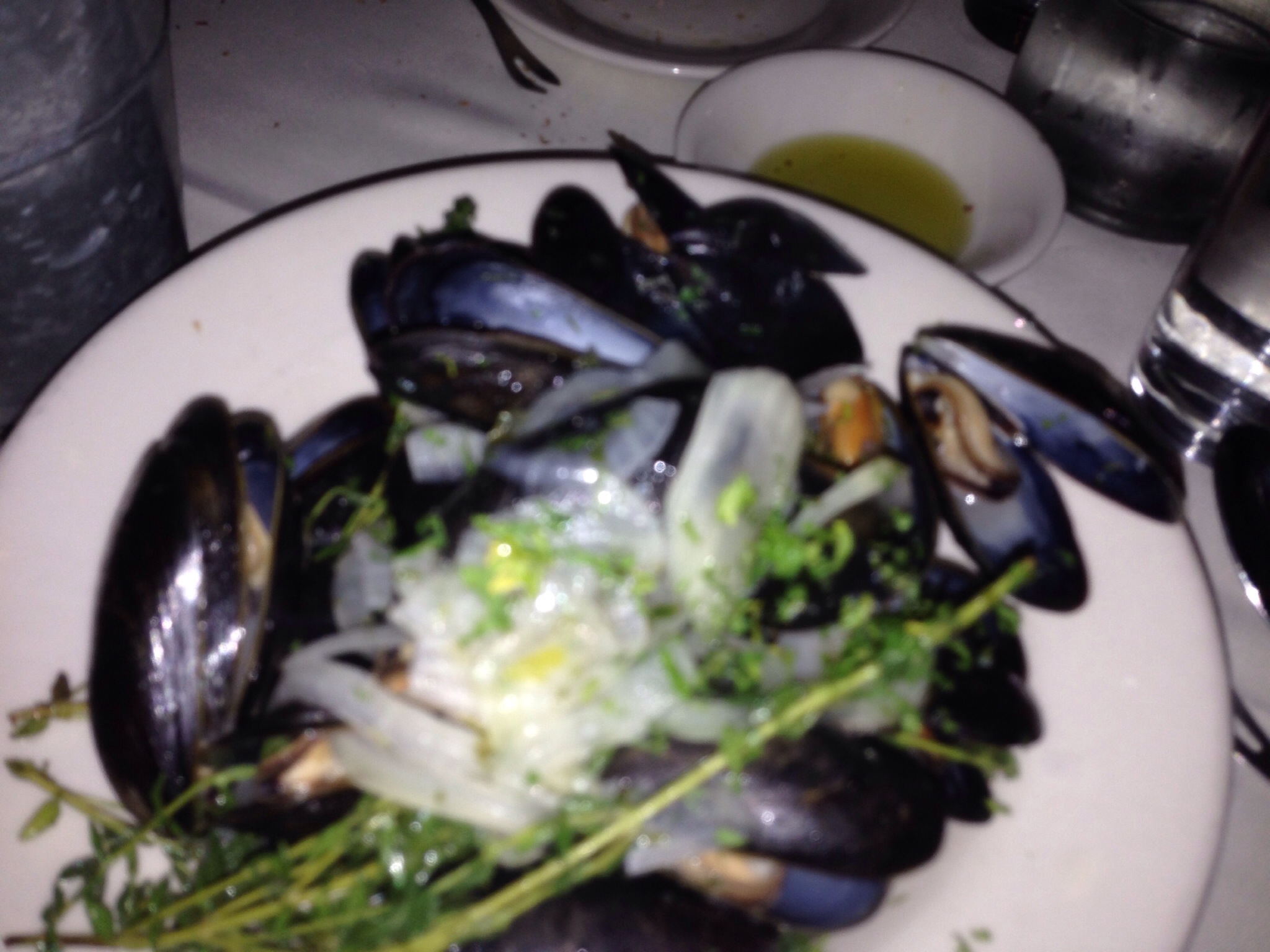 Moules Marinières: steamed mussels in white wine and fresh herbs. This is the classic preparation. I apologize for the out of focus picture; I did not have my regular camera with me and had to make do with a borrowed one. Despite the photo, the mussels were excellent. Very clean, fresh and the sauce was perfect. The bread that we used to dip the sauce was also very authentically French.