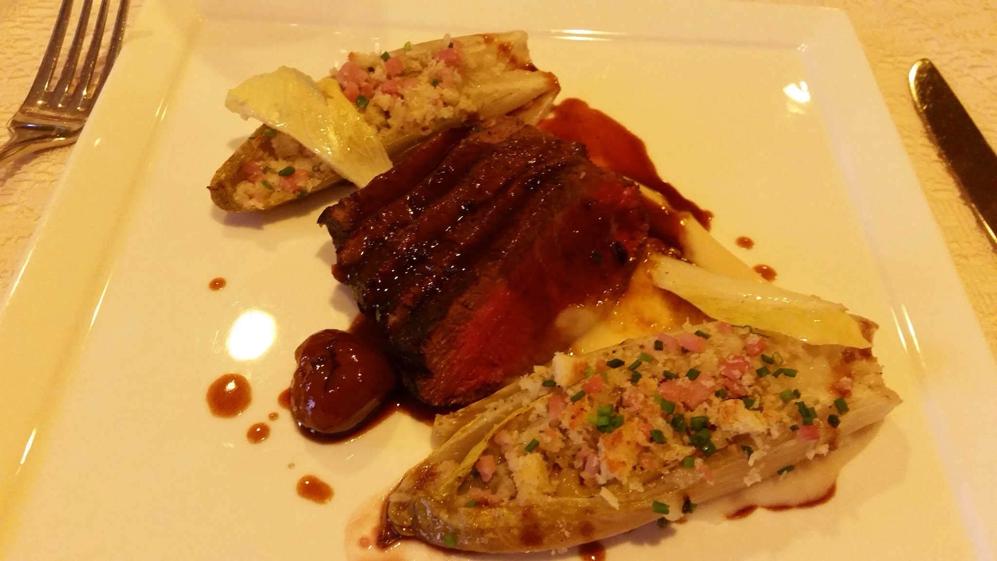SADDLE OF VENISON POIVRADE SAUCE: Compote of Rosemary-Granny Smith apple, crusted endives with cubes of ham and Swiss cheese. I loved this dish. I heart it whole-heartedly. I strongly persuaded two friends to change their orders from the Bronzino to the venison.