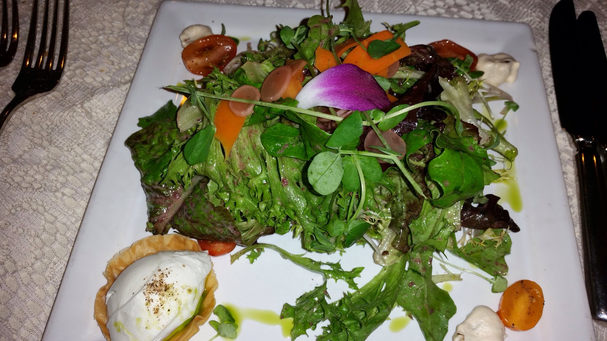 COMPOSITION OF SEASONAL GREENS, TAPENADE VINAIGRETTE: Radishes, pickled carrots, walnut cracklings, burrata cheese. This dish received high remarks from the eater – you know who you are, Dave.