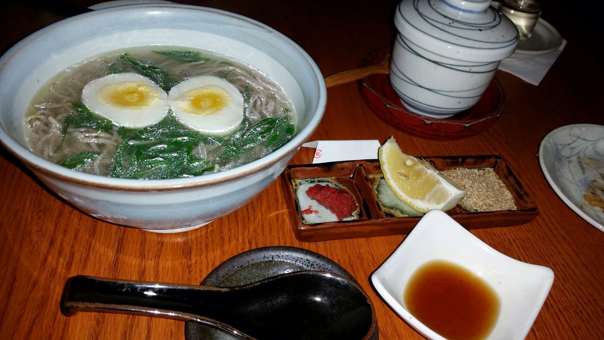 Shio Soba 塩蕎麦 in hot chicken & veg. broth topped w/ scallion & boiled egg side toppings of pickled plum, sea salt, sesame & sesame oil. Tasteless. Don’t know why the soba was such a big deal.