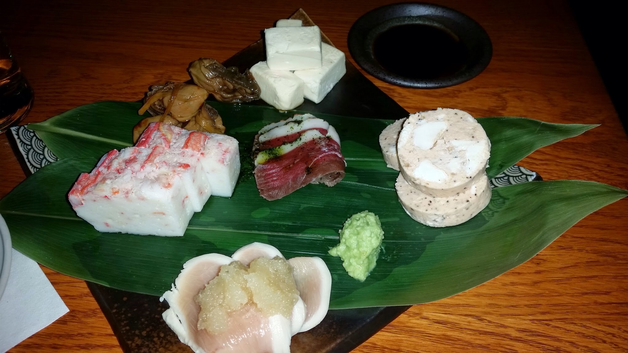 From the top running counter clock wise: Miso Cheese 赤味噌とクリームチーズのエンダイブのせ: Reddish-brown bean paste & cream cheese on endive (This is a hit or miss. My friend thought it was the bomb, tasted like dessert. I thought it was disgustingly weird for cream cheese to be eaten in a Japanese restaurant); stir fried oysters in soy sauce which was passable; fake crab cake that was too soft and sweet; chicken breast that was half-cooked but tasted fine; some sort of chicken with cream cheese in the middle (disgusting). At center is the Mochi Bacon もちベーコン: rice cake; this is another disgusting invention. #DisgustingJapaneseDishes