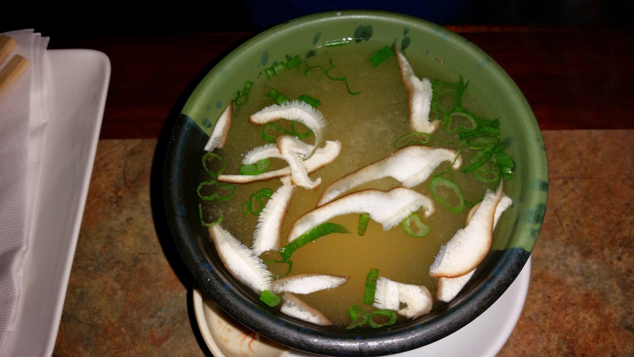 Miso Soup: Shiitake, seaweed, tofu, scallion。 普通,沒啥好喝。我家煮得比這兒好。香菇切得薄點兒。
