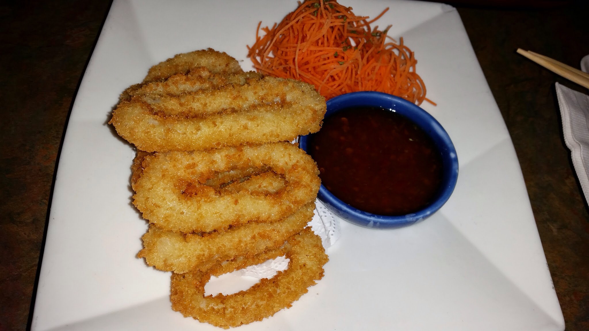 Thai Calamari: Sweet chili sauce,為什麼這是泰式的小管? 笑死人啊,這是炸得很懶的義大利式的小管。難吃難吃。也很醜,長的像洋蔥圈一樣。