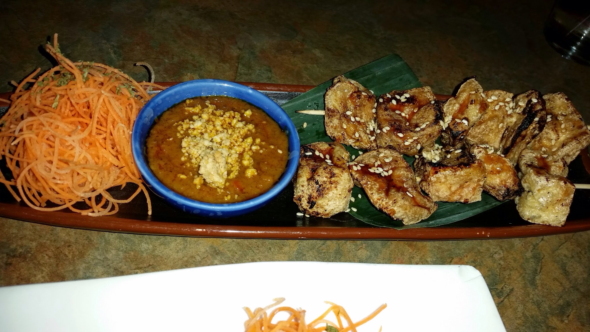 Grilled Tofu Skewers: Peanut sate sauce. 這盤豆腐是馬馬虎虎的。我真的是很想要吃台灣的臭豆腐。但因我在美國流浪二十九年,不長回家,我真需要好好學會忘記食物的記憶,不然眼淚就哭也哭不完。