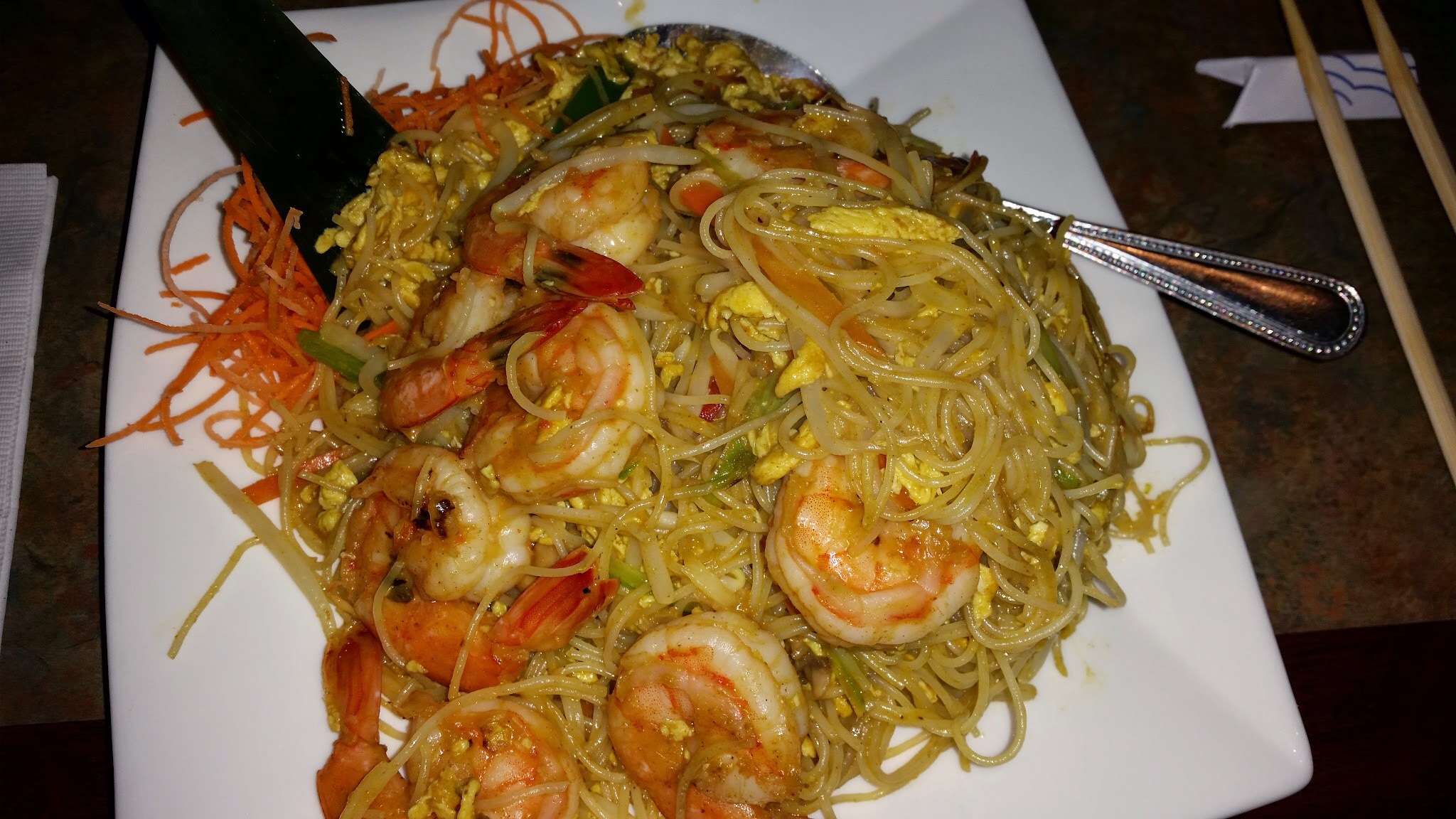 Singapore Noodle: Thin rice noodle, egg, celery, carrot, pepper, onion, bean sprouts, sesame in curry sauce. 新加坡炒米粉煮得很適合美國人口味,很美式。蝦子很多很大,讓妳覺得值得這個價錢。但是,因為他太美式了,很讓我想念台南的柦子米粉。去年暑假有po過,按這兒看。也讓我想起一位董阿姨煮給我們吃的台式米粉和大腸麵線,越想肚子越餓。