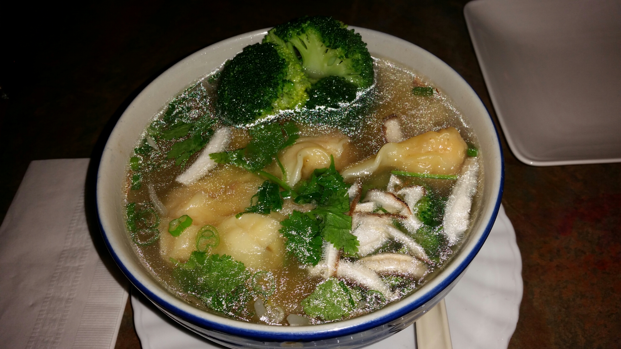 Shrimp Wonton Broth Noodle:Thin egg noodle w. clear chicken broth, baby bokchoy, shiitake, enoki。這是我老公的菜,老公是我家的大廚師,所以我沒有問他的意見。 結婚這麼久了,他煮我吃,他點我吃, 我不批評!