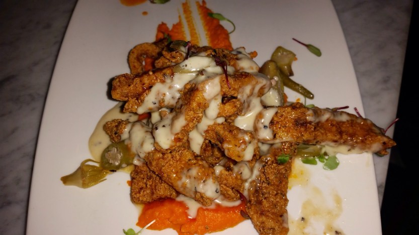 Chicken Fried Calamari: Carrot puree, pickled okra, thyme scented honey, bourbon smoked peppercorn gravy, house made hot sauce.