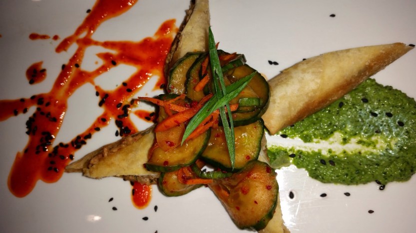 Roasted Red Curry Chicken Spring Rolls: Cucumber kimchi, peppadew coulis, cilantro-jalapeno puree, scallion. Anything would taste good when you are starving. But I believe this was more than hungry satisfaction. The spring rolls were not greasy but crisp. The jalapeno puree, peppadew coulis and the kimchi cucumber combination made me lick up all the sauce on the plate.
