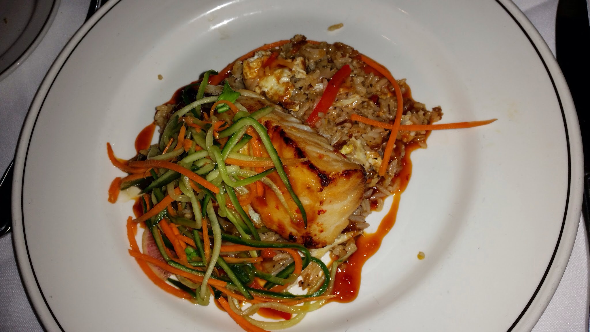 Miso-Glazed Seabass: MSC certified South Georgia Chilean seabass served with crab fried rice and chilled cucumber slaw. Kayla, my strategist and an excellent fisherwoman (you should seen the fish she caught), went back and forth on her consideration between this and the Cioppino (Fresh fish, shrimp, mussels, calamari, and crab simmered in a tomato and herb broth). I was so looking forward to trying the Cioppino… Or bouillabaisse in French.