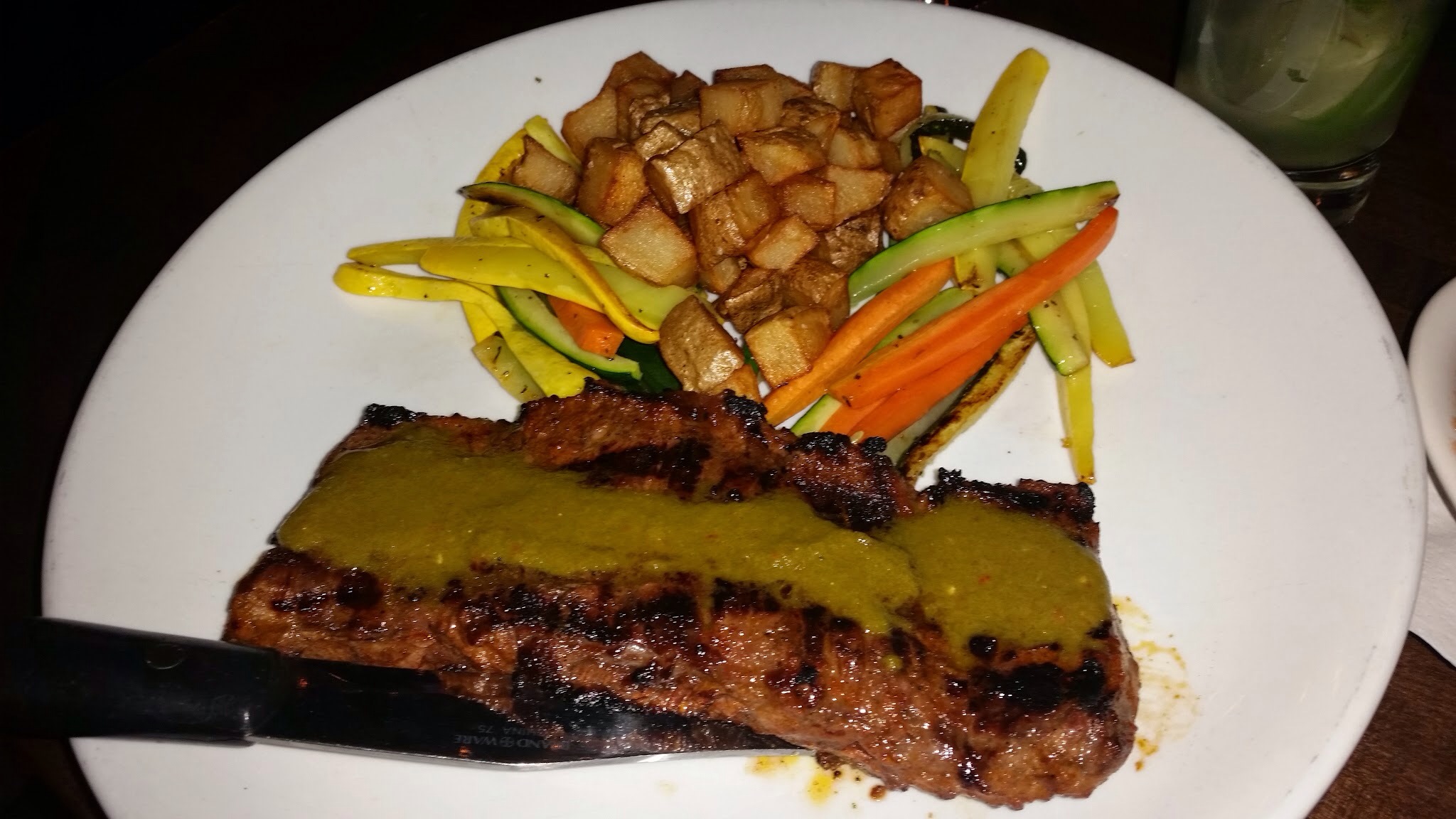 Chimichurri skirt steak with roasted vegetables & potatoes, chimichurri sauce. This dish in comparison to mine was much better. I guess it’s hard to go wrong when it’s just a big piece of steak. The chimichurri sauce was a tasty addition if you smother it evenly across the steak.
