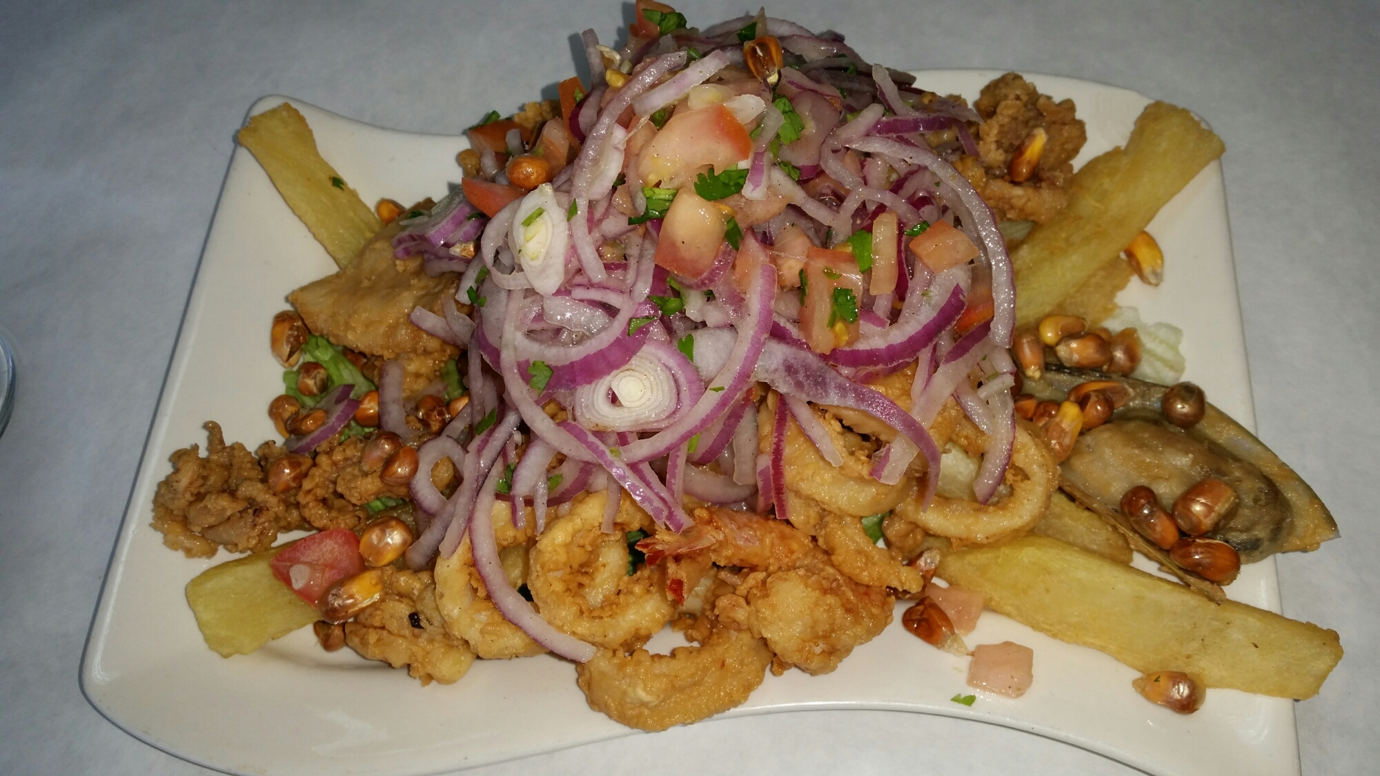 This is the Jalea: fried, breaded seafood platter topped with onions and tomatoes in lime juice. It was a rainy and cold day. My feet were wet from jogging through the slush in Queens. I needed fried food and the waitress talked me into it! But it was not so good… The seafood was the frozen kind. All traces of sea-ness had been fried out of them. Bad. The one point of redemption was on the roasted corn kernels. I picked them out and ate them all.