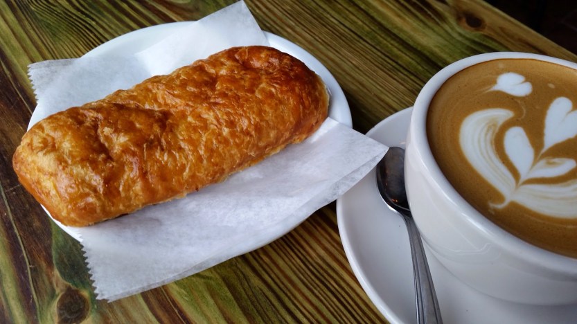 My latte with a chocolate croissant. I asked for the croissant to be warmed up. Seriously, who would eat a cold chocolate croissant? Don’t you want to melt the warm, sweet gooeyness inside? I was handed a staled and room-temp croissant. Even after it was warmed up, it was still rubbery. Bad bad pastry!