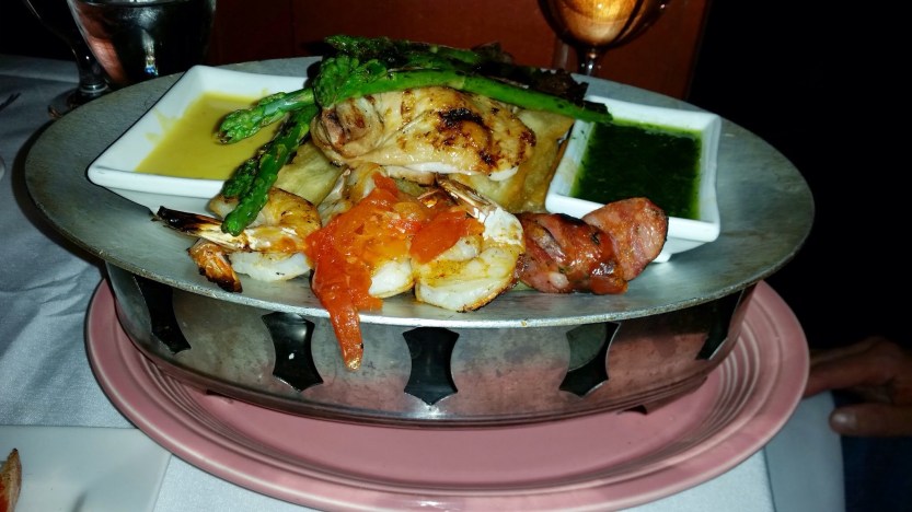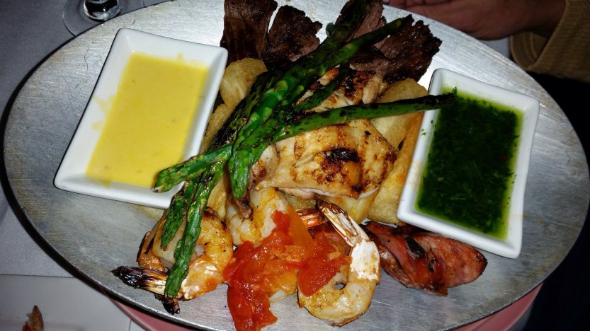 Argentina PARILLADA: Meat Plater with Shrimp, Skirt Steak, Chicken Breast, Chorizo, yucca fries and Garlic Mojito. This dish looked impressive from afar but I cannot tell you if it tasted good because I did not try it. The person who had this dish was so boring that I wanted to keel over and play dead just to get out of the conversation.  I sure was not going to ask to try the food.