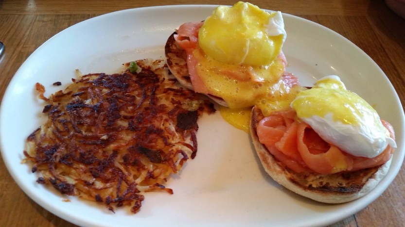 βSlamonβ Benny: Smoked Salmon, Poached Eggs, Hollandaise on an English Muffin and Hashbrowns. The upside: the hash was awesome. The downside: the eggs were over-poached and the salmon was too thick and voluminous. This was not my dish but sitting across from it, I had no desire to try it. The proportion looked wrong. In addition, the Hollandaise sauce congealed quickly and made the entire dish even less visually attractive.