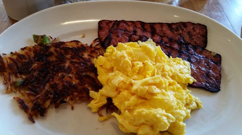 Special for the Day: Turkey Bacon, Scrambled Eggs, and Hashbrowns. The upside: the hashbrown and the grilled Turkey bacon were awesome. The downside: the eggs were bland even after I mixed in ketchup and hot sauce. And this was not the first time the eggs had disappointed me. I could have done it better myself!
