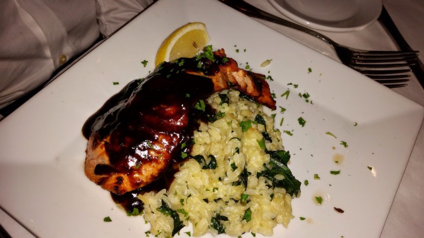 Balsamic Mustard Glazed Salmon: Over spinach risotto.