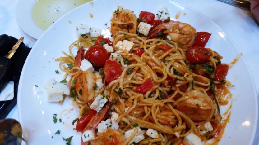 Shrimp Splendido: Sautéed with tomatoes, basil, capers & garlic tossed with homemade spaghetti, topped with crumbled feta cheese.