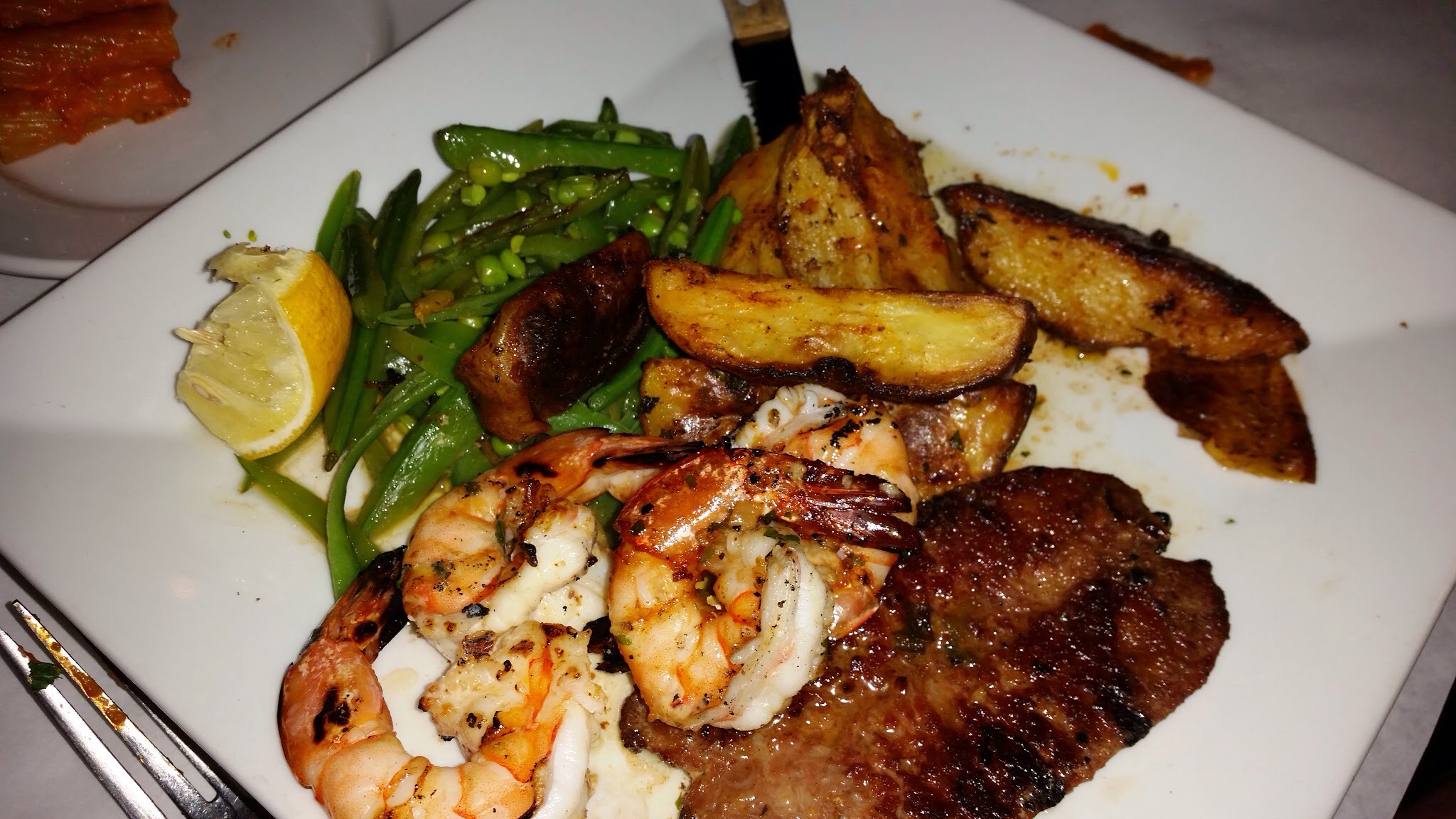 Mixed Grill: Shrimp, chicken, Italian sausage, garlic scallion butter, roasted potatoes.