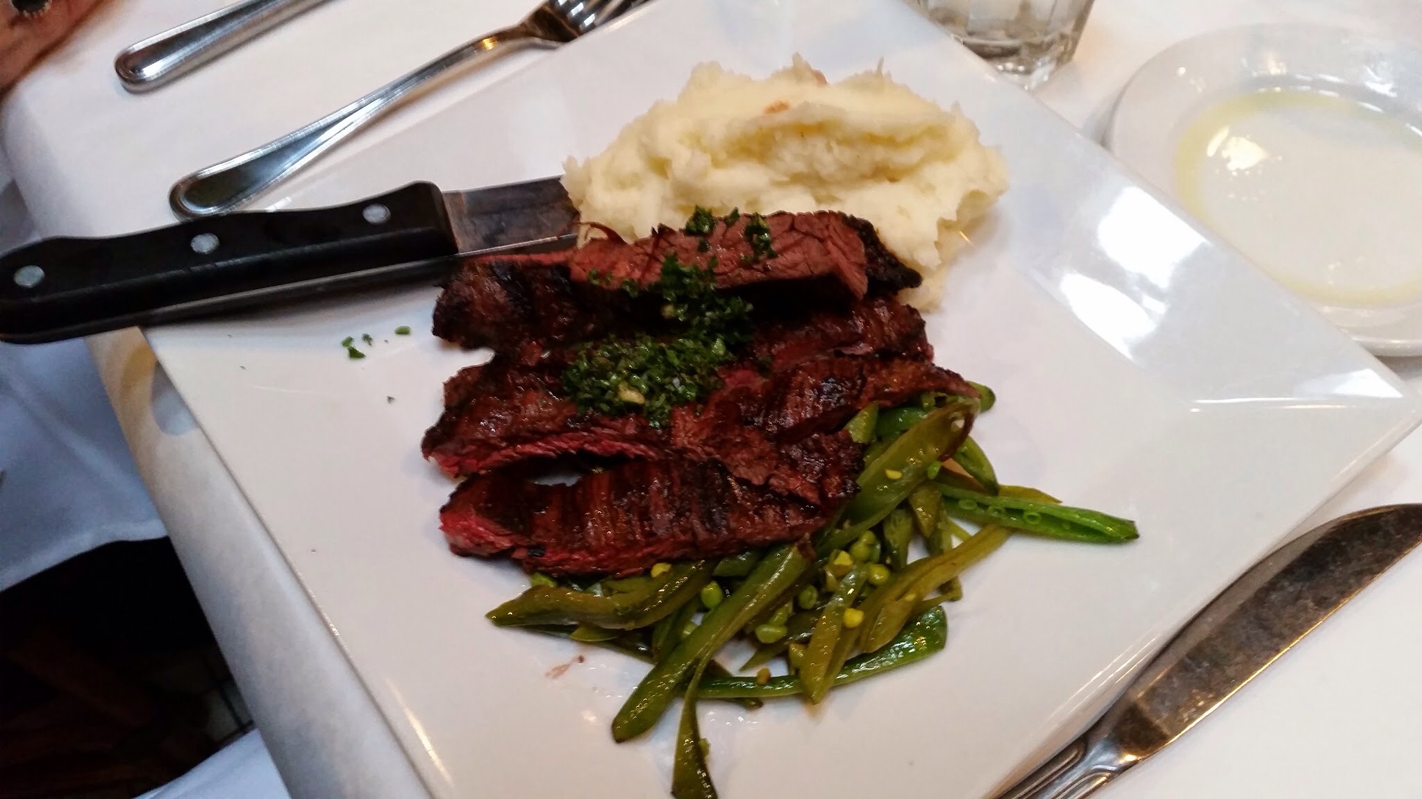 Grilled Skirt Steak: Chimichurri with roasted fennel mashed potatoes. Guess whose dish this is? Too greasy. My original steak was not medium but well done. In fact, they made a mistake in taking our large group order and someone (thank you, Jen!) gave me her “rare” steak that is just the right medium.