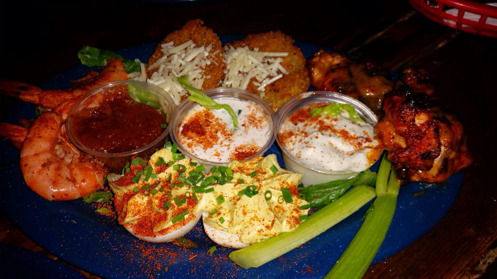 SWAG SAMPLER PLATE: drunken spicy shrimp boil, chicken wings, fried green tomatoes, devil eggs. The shrimps and the chicken wings were average at best. The fried green tomatoes seemed interesting but had too much batter and were over-fried. The devil eggs had too much mayo and tasted disgusting.