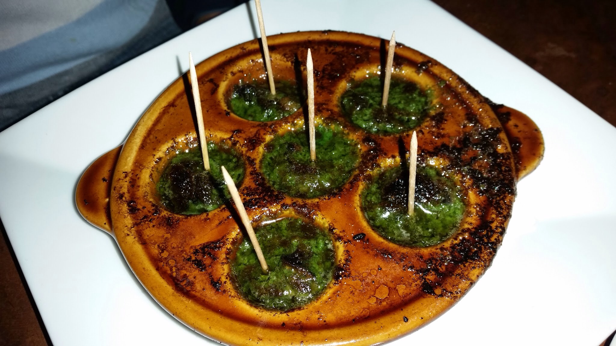 Escargots: snails, “beurre persille” Decent – almost as good as that of my ex French mother-in-law. This is proof that one doesn’t need to be a chef or own a restaurant to make good escargots.