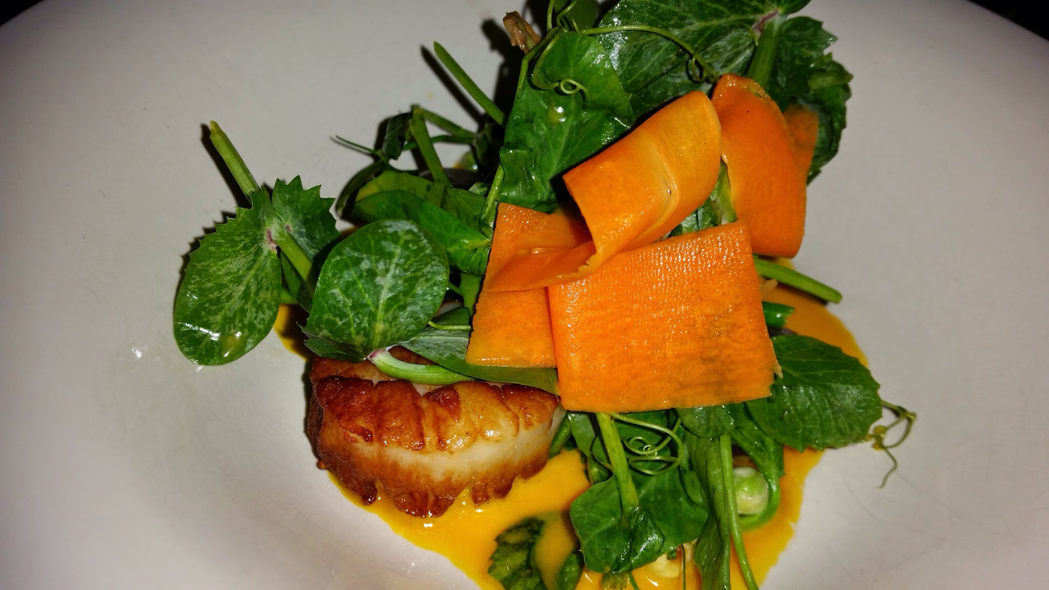 Seared Sea Scallops on top of arugula. This was great. High quality scallops seared to perfection. The bitterness of the arugula contrasted well with the slightly sweet scallops and carrots. Wonderfully delicious.