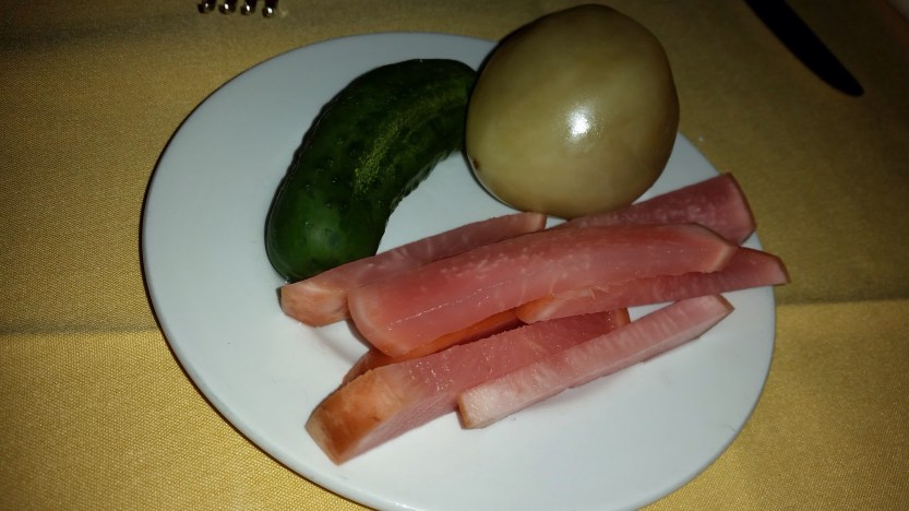 This is a plate of extremely sour pickled vegetables. So sour that as soon as you put a piece in your mouth you start to salivate. The pickle was the least sour; the green tomato was the most sour. I ate the whole tomato and had to wipe off my drool with a napkin! I just kept on going back for more… Very unique.