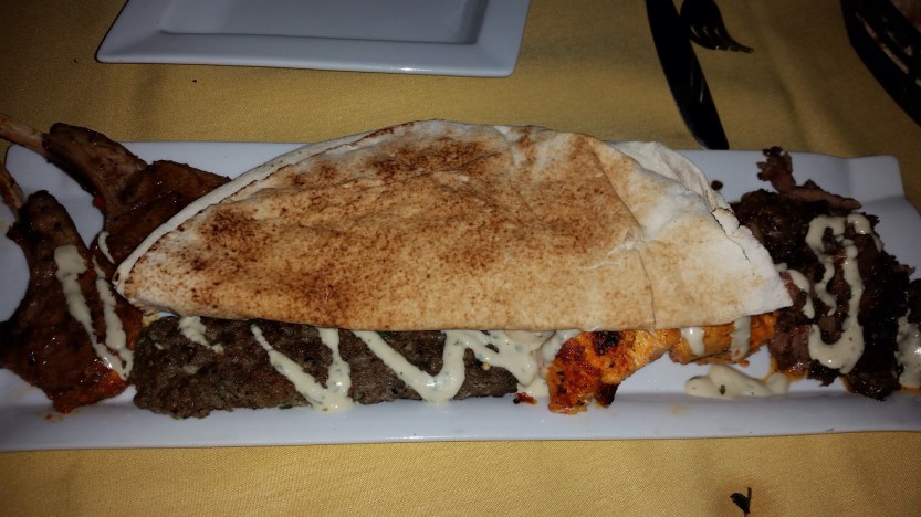 MIXED GRILL: A real fiesta combination of shish kabobs and shawarma (lamb shish, chicken shish, lamb kafta, lamb chops and shawarma). They use oak, hickory and mesquite wood, served with tahini sauce, salad and rice or bulgur pilaf and vegetable of the day. I so wish this were better. It had all the promises of being good- I checked out their grill before ordering; this is what they specialized in. Alas, the meat (lamb and shawarma) was dry and rubbery which depleted all flavors from the spices. The chicken was the best because it was moist.