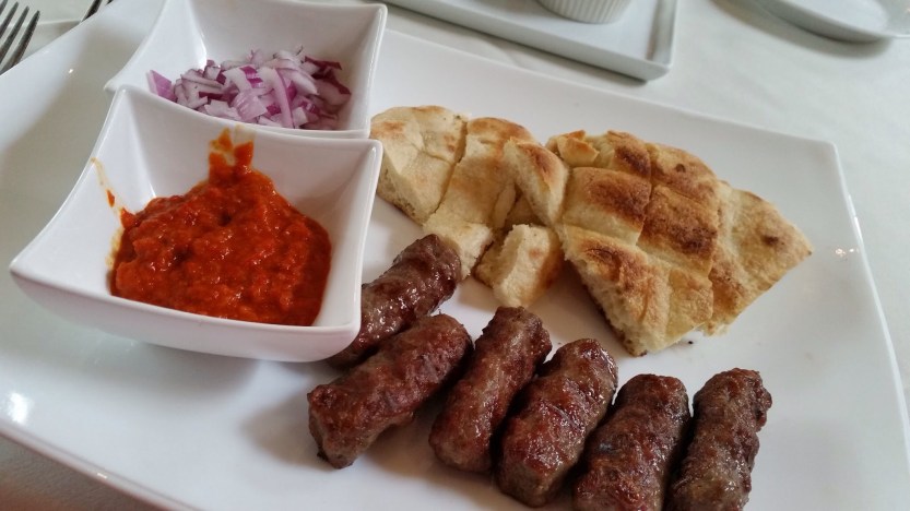 Čevapčići: A traditional croatian dish of grilled minced meat, a type of kebab/sausage served with ajvar vegetable spread, red onions and pita bread. The grilled meat sausages were moist on the inside and nice and firm on the outside. The ajar vegetable spread is the best part of the dish. Dipping the meat into the spread and then coupling up with some red onions is the way to go.