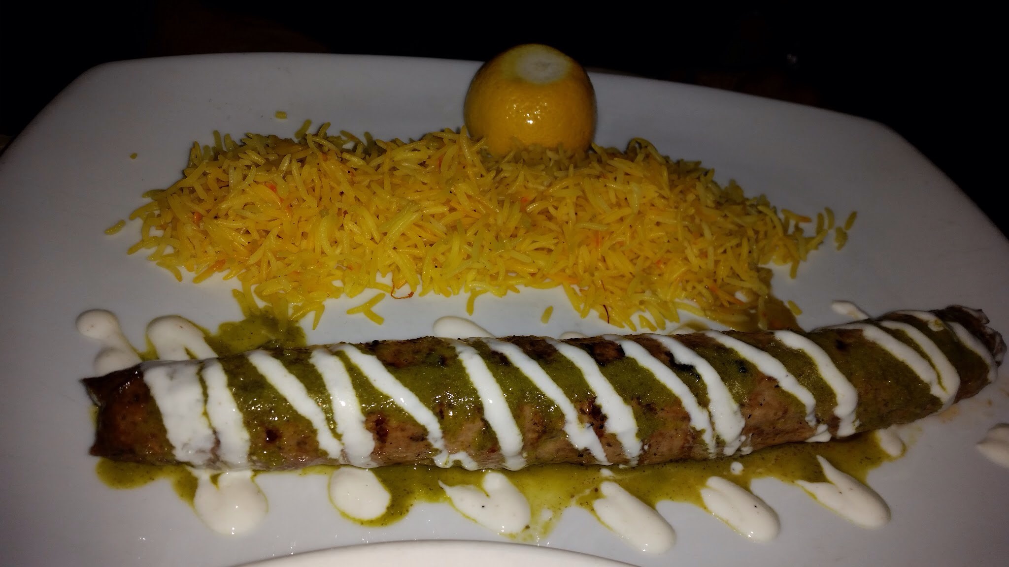 Lamb Kofta Kabob: Afghan spices, choice of mixed green salad or saffron rice. Kraft calls itself an “intimate, candlelit eatery showcasing eclectic Mediterranean-New American food for brunch & dinner.” It’s intimate all right – I could barely see my food. Once I saw the Lamb Kofta Kabob… A brown cylinder with green sauce and white yogurt drizzled on top. It was not aesthetically pleasing and unfortunately the lamb failed to deliver on the taste for my friend. In comparison, I thought it was all right. The meat was not dry and the saffron rice was acceptable but the plating was eclectic. What’s half a lemon doing there?