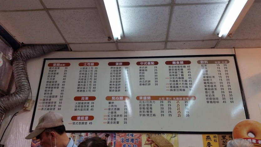 The fusion menu with categories in burgers, toasts, bagels, crêpes, snacks (side dishes of fries, hot dogs, chicken nuggets, red bean pancakes, and onion rings), Chinese style (scallion pancakes, taro cakes, dumplings), noodles (pasta and Asian style noodles), jams (from peanut butter to green tea/taro/black sesame), drinks (from soy milk, black tea, green tea to cafe latte).