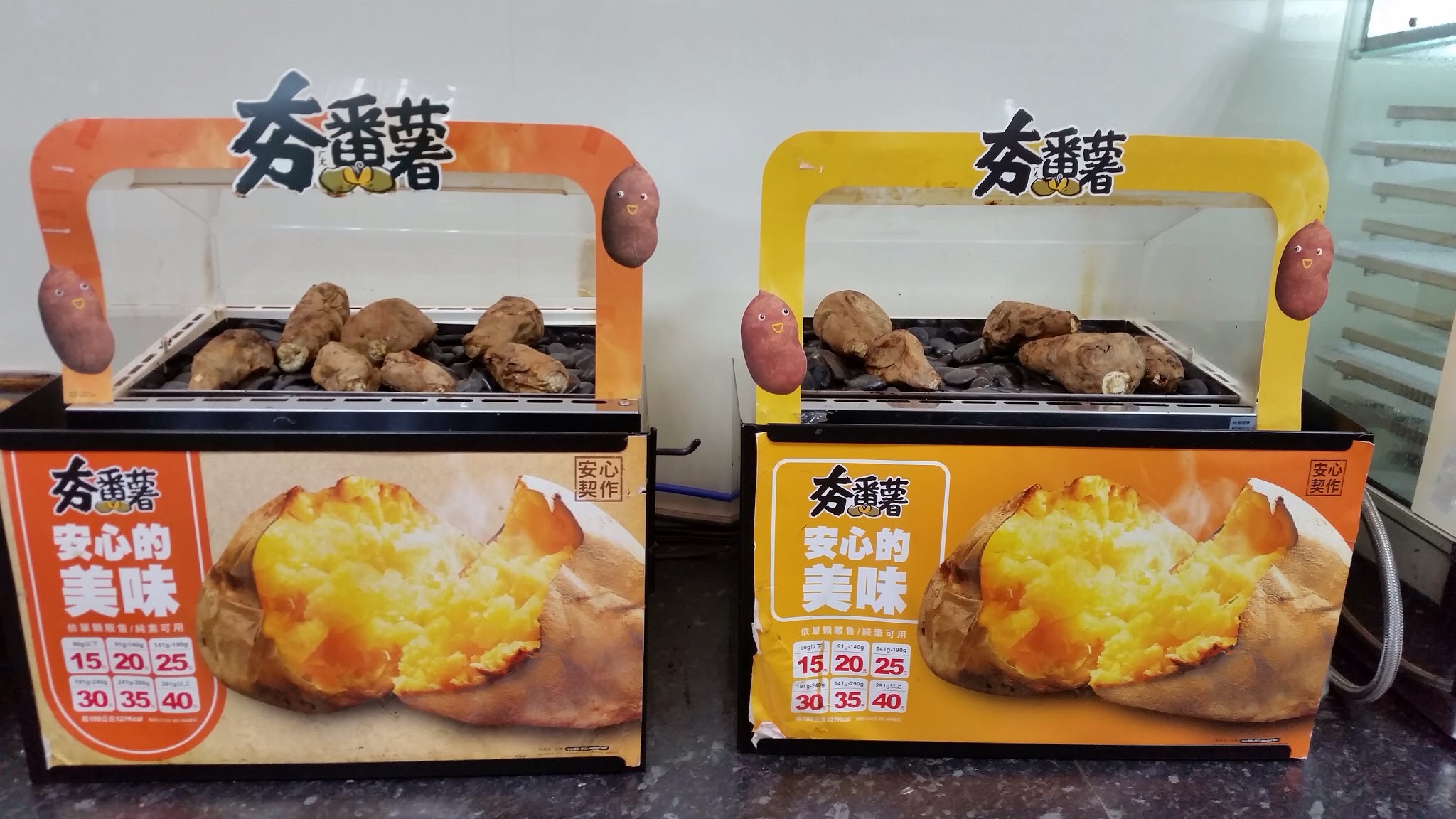 This is not something you see often… charcoal grilled hot potatoes and yams inside a store.