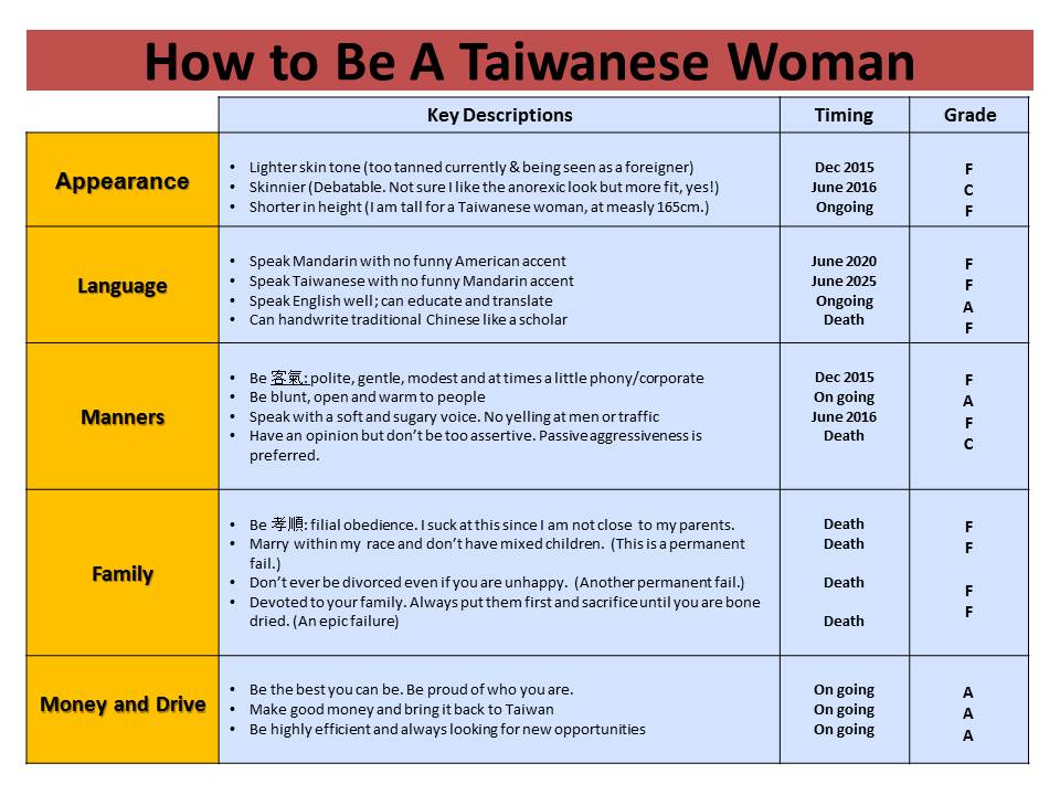 But I also realized that since I don’t feel authentically Taiwanese, I needed to have an improvement plan for me to work on while back in NY. Here is my action plan, projected timing and current performance.